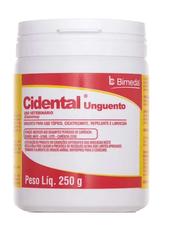Cidental® Unguento 250gr - Bimeda é indicado para Bovinos no tratamento de todos os ferimentos, inclusive do umbigo dos bezerros recém-nascidos, como larvicida e repelente de moscas em geral (Cochliomyia hominivorax), na cura e na prevenção das miíases (bicheiras).